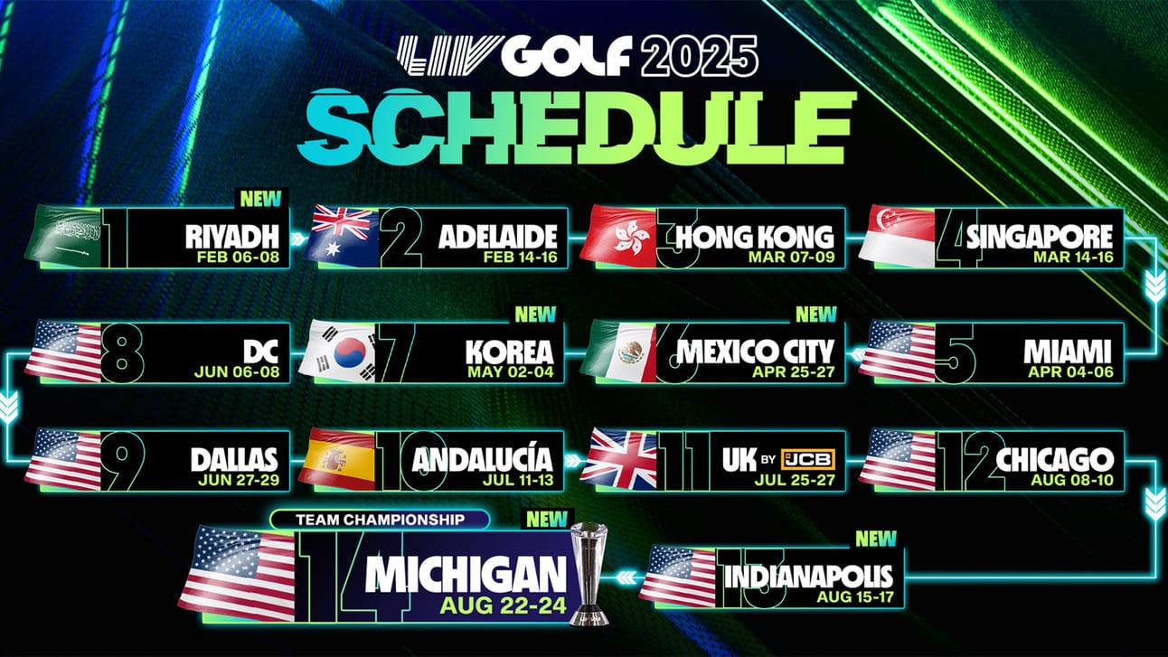 LIV Golf has finalized its 2025 schedule, including three new venues and a return to Trump National Doral. New locations include Club de Golf Chapultepec in Mexico City and Robert Trent Jones Golf Club in Virginia. The season concludes at The Cardinal in Michigan, wrapping up by August 24 to avoid football overlap.